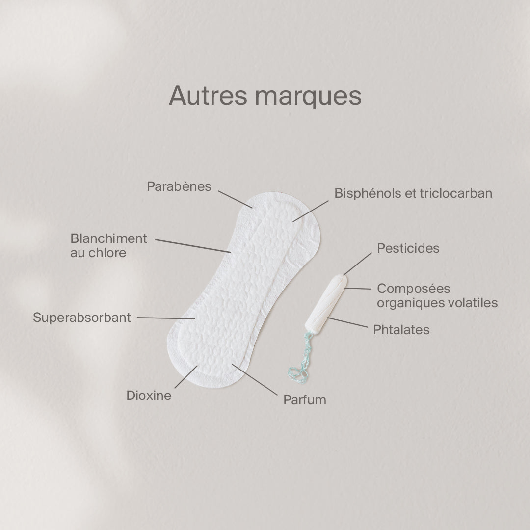 Découvrez nos serviettes menstruelles à ailettes composées uniquement de coton 100% biologique, sans aucune substance chimique.