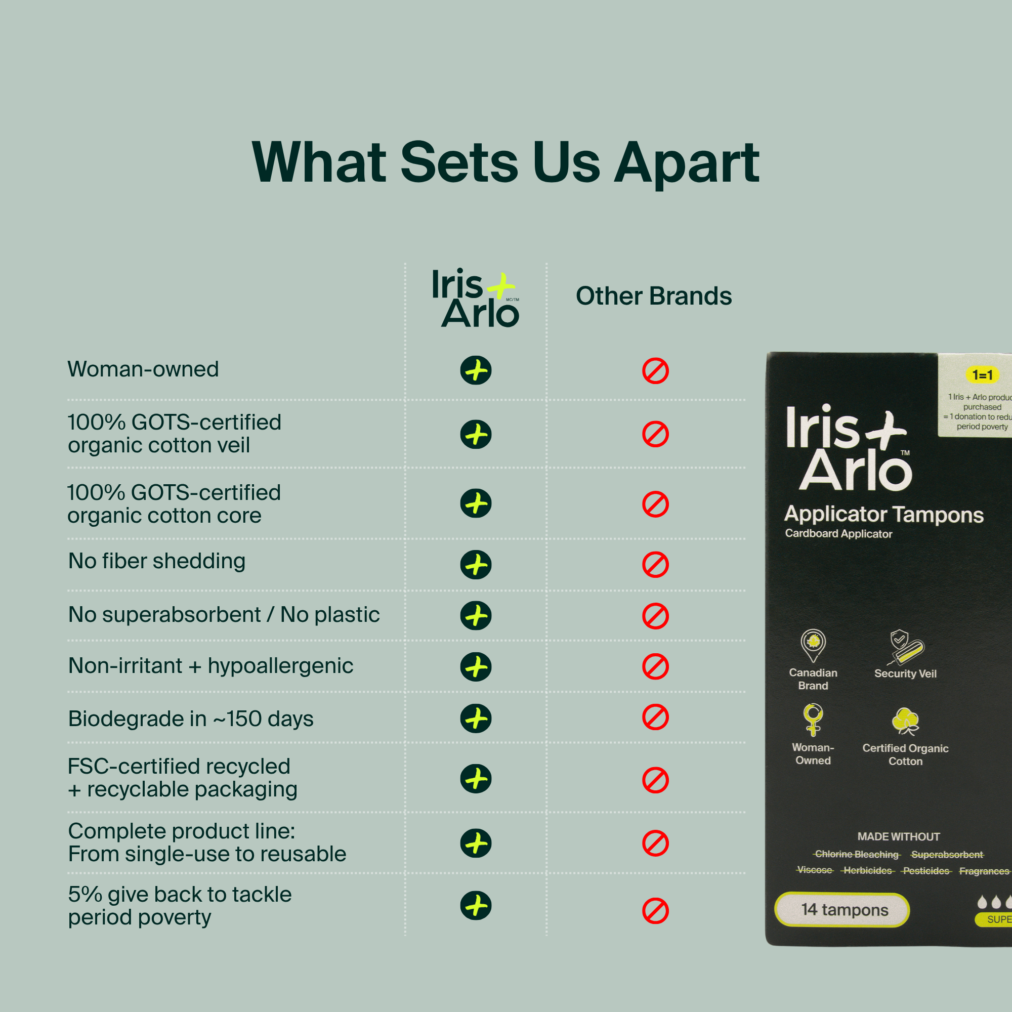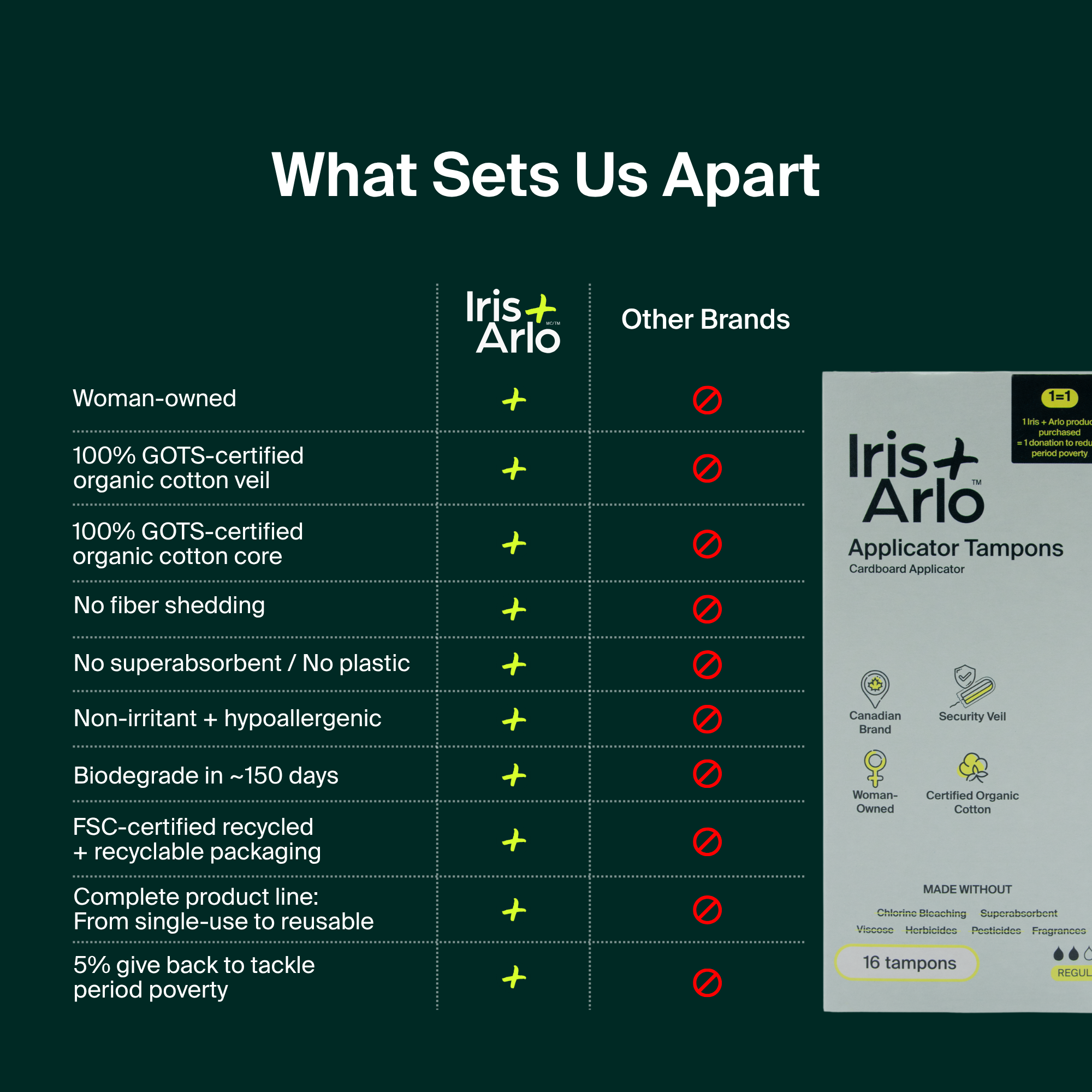 Iris + Arlo a choisi des matériaux durables, de sorte que nos tampons mettent environ 150 jours à se décomposer.