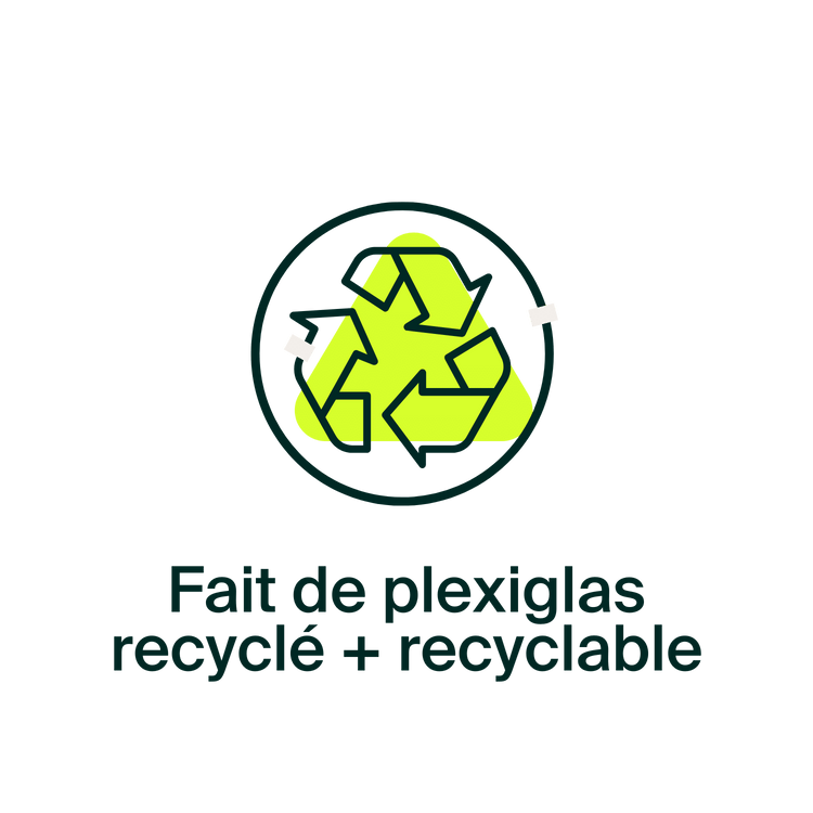 Puisque qu’il est important pour nous de prioriser la fabrication de produits durables, noter que les distributeurs en plexiglas transparents sont faits de matériaux recyclés, ce qui donne une légère teinte à la matière.